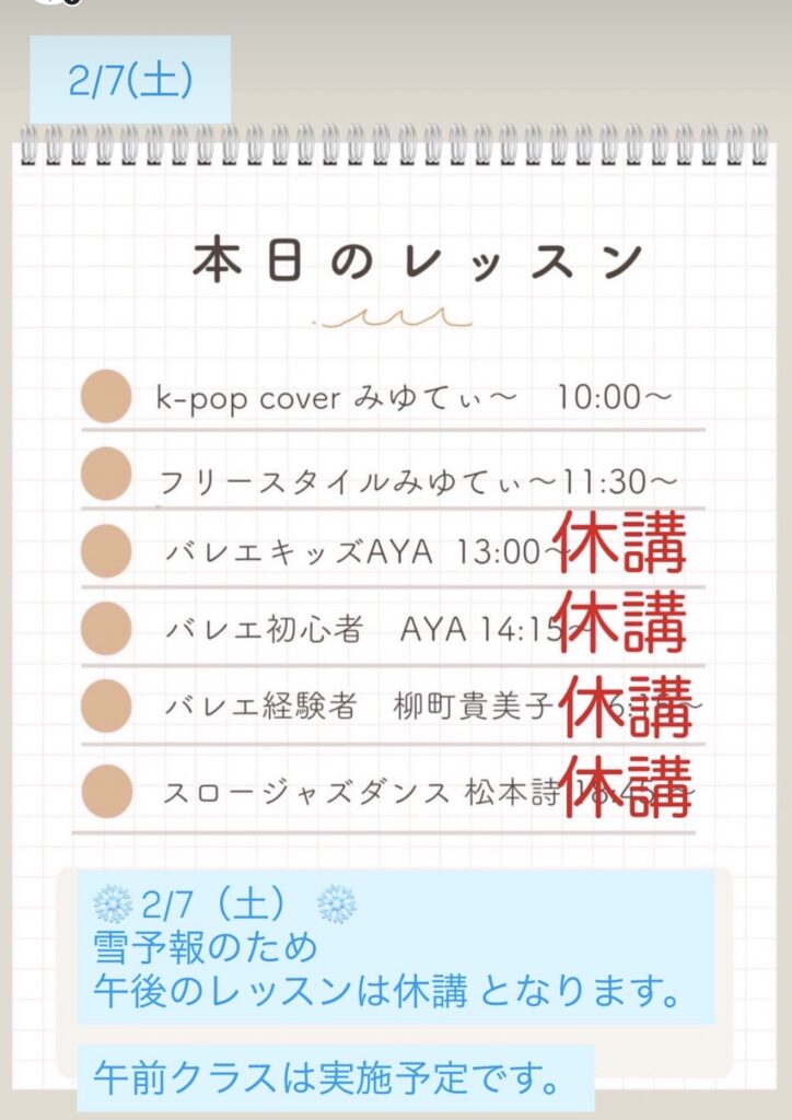 【2/7(土)⛄レッスン休講・一部実施のお知らせ】