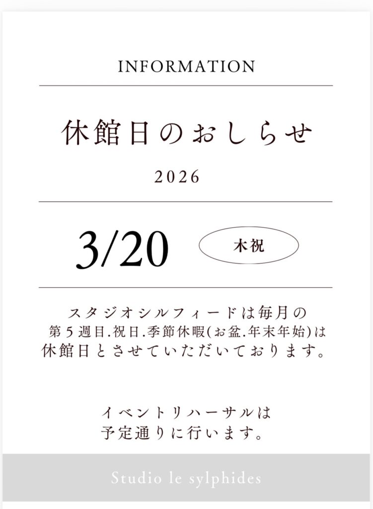 2026.03.19【3月20日(金・祝)】は祝日のため、スタジオは休館日とさせていただきます。